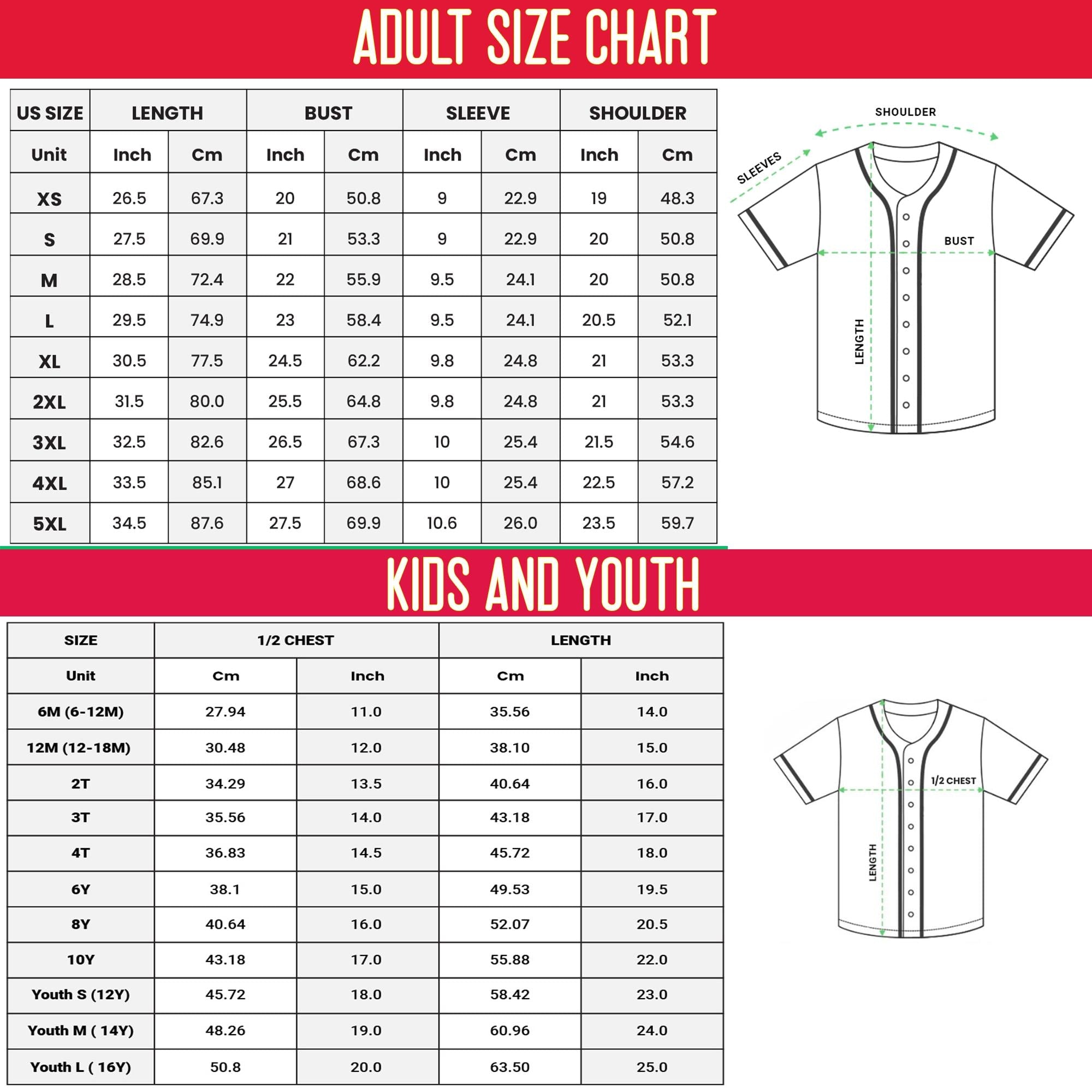 XS, S, M, L, XL, 2XL, 3XL, 4XL, 5XL, YOUTH - S (12Y), YOUTH - M (14Y), YOUTH - L (16Y), 6M (6-12M), 12M (12-18M), 2T, 3T, 4T, 6Y, 8Y, 10Y |